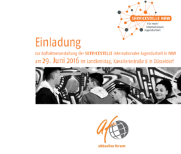 Am 29. Juni 2016 hat Staatssekretär Bernd Neuendorf (Ministerium für Familie, Kinder, Jugend, Kultur und Sport des Landes NRW) die neue „Servicestelle für internationale Jugendarbeit in NRW“ auf den Weg gebracht. Sie wird vom Land finanziert und ist beim aktuellen forum in Gelsenkirchen angesiedelt, einem anerkannten Träger der politischen Weiterbildung mit langjährigen und vielfältigen Erfahrungen in der internationalen Jugendarbeit.