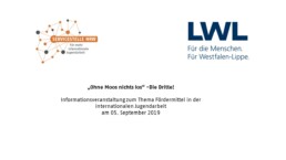 Die Servicestelle für mehr internationale Jugendarbeit lädt herzlich zur dritten Veranstaltung "Ohne Moos nichts los" am 05. Septmeber nach Münster ein. In Kooperation mit dem Landschaftsverband Westfalen-Lippe wird die Veranstaltung rund um das Thema Fördermittel informieren. Es wird die Möglichkeit geben an drei verschiedene Workshops teilzunehmen, um einen Einblick in die verschiedenen Fördermöglichkeiten auf Landes-, Bundes-, sowie EU-Ebene zu bekommen.